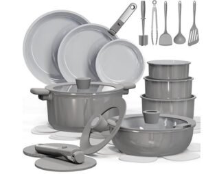 CAROTE 27pcs Ceramic Cookware Set Nonstick usually runs around $109 – 150 depending on sales and color (like Navy Blue, Green, or Dark Gray), and it packs a massive 27 pieces including multiple fry pans (8″, 10″, 12″), various saucepans (1.5-qt to 4-qt), a sauté pan, stockpot, universal lids, detachable handles, trivets, and a bunch of kitchen utensils like turners.